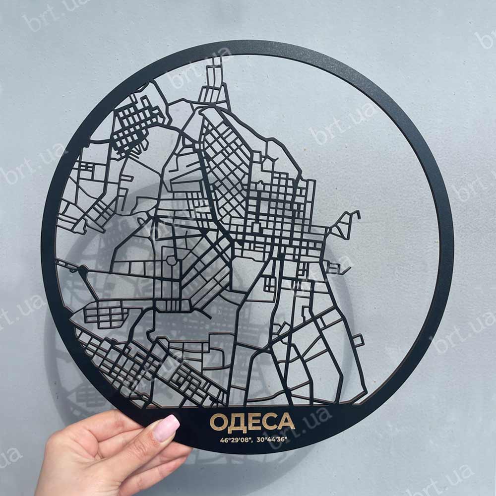 Інтер'єрна одношарова карта Одеси розробляється на основі топографічних карт з виділенням контрастних, знакових елементів та об'єктів – дороги, квартали, річки, море, лісові насадження, та виготовляється методом лазерного гравіювання та різання на високоточному обладнанні.